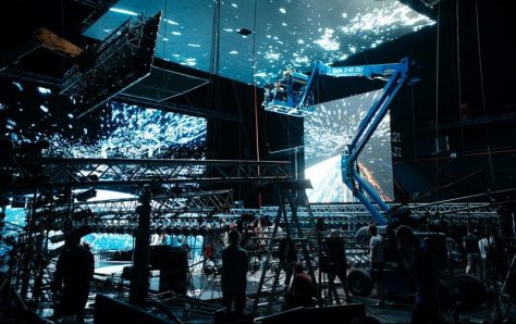 На съёмках «Свободного падения» использовались уникальные виртуальные декорации — LED-экраны общей площадью более 400 квадратных метров, созданные студией WELCOME POINT. Эта технология, получившая известность после сериала «Мандалорец», призвана заменить традиционный хромакей («зеленый экран») и облегчить период постпродакшна.